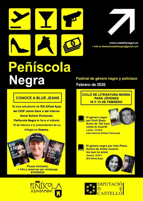 Dentro de la programación del festival en su sede de Orpesa, está prevista la visita del best seller del thriller juvenil, Blue Jeans. Peñíscola negra quiere facilitar la asistencia a todos los alumnos de los tres centros educativos del municipio que lo deseen, y pone a su disposición el traslado el sábado 15 desde Peñíscola a Oropesa.