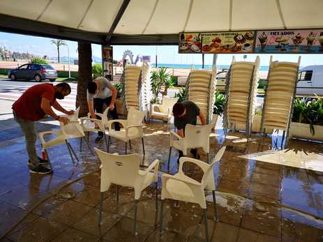 Los negocios de restauración de Peñíscola se preparan para la apertura de las terrazas, en estas primeras horas en las que el municipio estrena la fase 1 de la desescalada programada por el Gobierno.