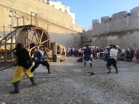 Esta tarde se ha llevado a cabo la primera performance en la Plaza de Bous bajo la temática "Aventuras y piratas". Con el escenario de rodaje atrezzado y decorado, "La rueda del infierno" ha mostrado a los espectadores cómo se desarrolla un rodaje en vivo.