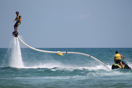 “La gente sale alucinada”, y es que pocos llegan a imaginar que con la única fuerza propulsora del agua se pueden alcanzar esas alturas. Esta actividad, que es una de las más demandadas en os principales destino turísticos, “se lleva a cabo a 200 metros de los bañistas, cuenta con una manguera de 12 metros respecto al fly. La altura máxima a la que se puede elevar es de 8 metros, aunque ésta sólo se recomienda para los profesionales, ya que a los principiantes no se les suelta más de 4 metros”, apuntan.