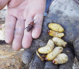 a es un coleóptero, parecido a un escarabajo de color rojizo-anaranjado, originario del sudeste asiático, que mide entre 19 y 42 mm de largo. Las larvas de este insecto excavan galerías dentro del tronco de las palmeras, deteriorándolas gravemente antes de que puedan verse los primeros síntomas visibles.