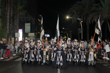 La lluvia no ha sido impedimento para que, esta noche, las calles de Peñíscola hayan acogido el primero de los dos desfiles de la Asociación Cultural de Moros y Cristianos. El pasacalle, que ha recorrido la Avenida Papa Luna hasta llegar a la Plaza de Bous ha centrado las miradas de miles de espectadores.
