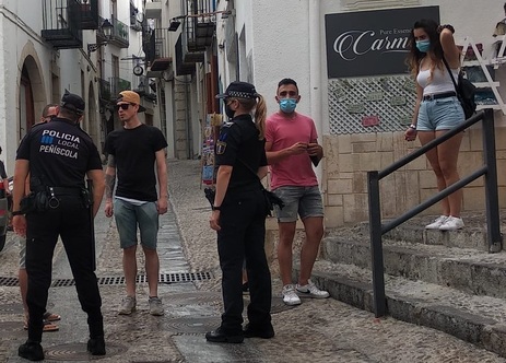 Los agentes de la Policía Local de Peñíscola están realizando patrullas informativas para el cumplimiento de las recomendaciones en materia de seguridad sanitaria. Concretamente, en estos primeros días tras la apertura de la movilidad entre provincias y entre comunidades autónomas,en el entorno del Casco Antiguo de la ciudad, por cuya configuración es difícil poder mantener la distancia de seguridad, se ha estado solicitando el uso de la mascarilla.
