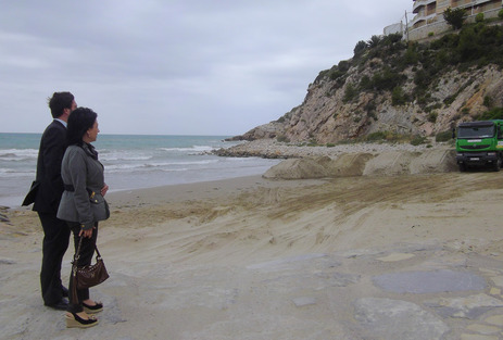 Su titular, Lupe Roig, ha acudido hoy a supervisar las tareas que se están llevando a cabo en esta cala contigua a la Playa Sur junto con el alcalde de la localidad, Andrés Martínez, que han valorado estas tareas como "necesarias para que en menos de un par de semanas las playas de la ciudad estén en perfecto estado de revista".
