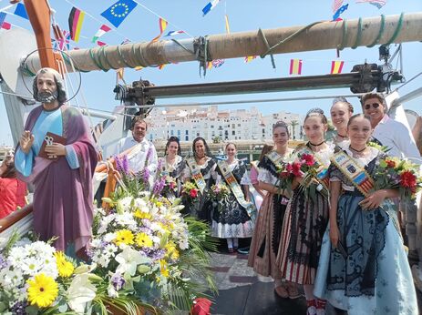 A continuación, las barcas de pesca han recuperado la tradición de salir en travesía marítima para acompañar la imagen de San Pedro, procesión en la que han participado también la Reina y Damas lanzando los ramos de flores al agua en honor a San Pedro.