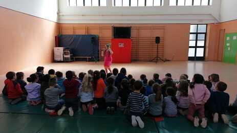 teatro de títeres en el CEIP Jaime Sanz, con actualizaciones de los cuentos de la Caperucita Roja y Los tres cerditos, para el alumnado de primero y segundo curso de primaria.