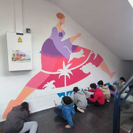• "La dona que fa passos de gegant" protagoniza una pintura de gran formato en el interior del CEIP Jaime Sanz, en cuya elaboración participa el alumnado de sexto curso de primaria