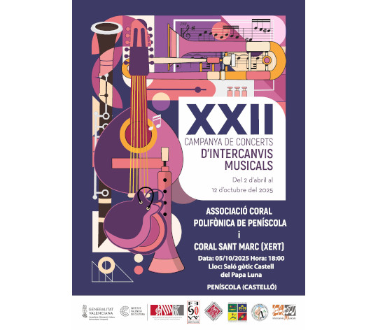 En esta ocasión, las agrupaciones participantes serán la Coral Polifónica de Peñíscola, dirigida por Raquel Bayarri Bayarri, y la Coral San Marc de Xert, dirigida por Carlos Vives Sebastià, que nos ofrecerán un concierto de música vocal con piezas individuales y también conjuntamente.