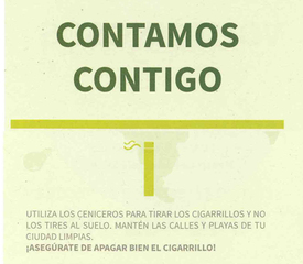 - Utiliza los ceniceros para tirar los cigarrillos y no los tires al suelo. Mantén las calles y playas de tu ciudad limpias ¡Asegúrate de apagar bien el cigarrillo!